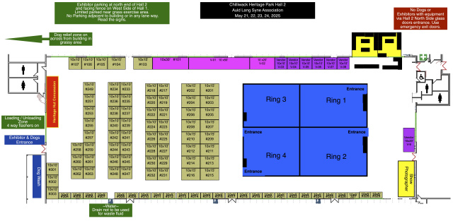 Grooming Notes: B) Reserved Grooming Space with Shared Power in the #200's and some in the #100's. Booking available by scrolling lower. Limited amount available. View the space layout on the map and proceed lower to book your site. Note: Dogs may be left overnight with contact information and a leash attached to crate. Note: Dedicated Power is not available due to the very high cost required by the service contractor.